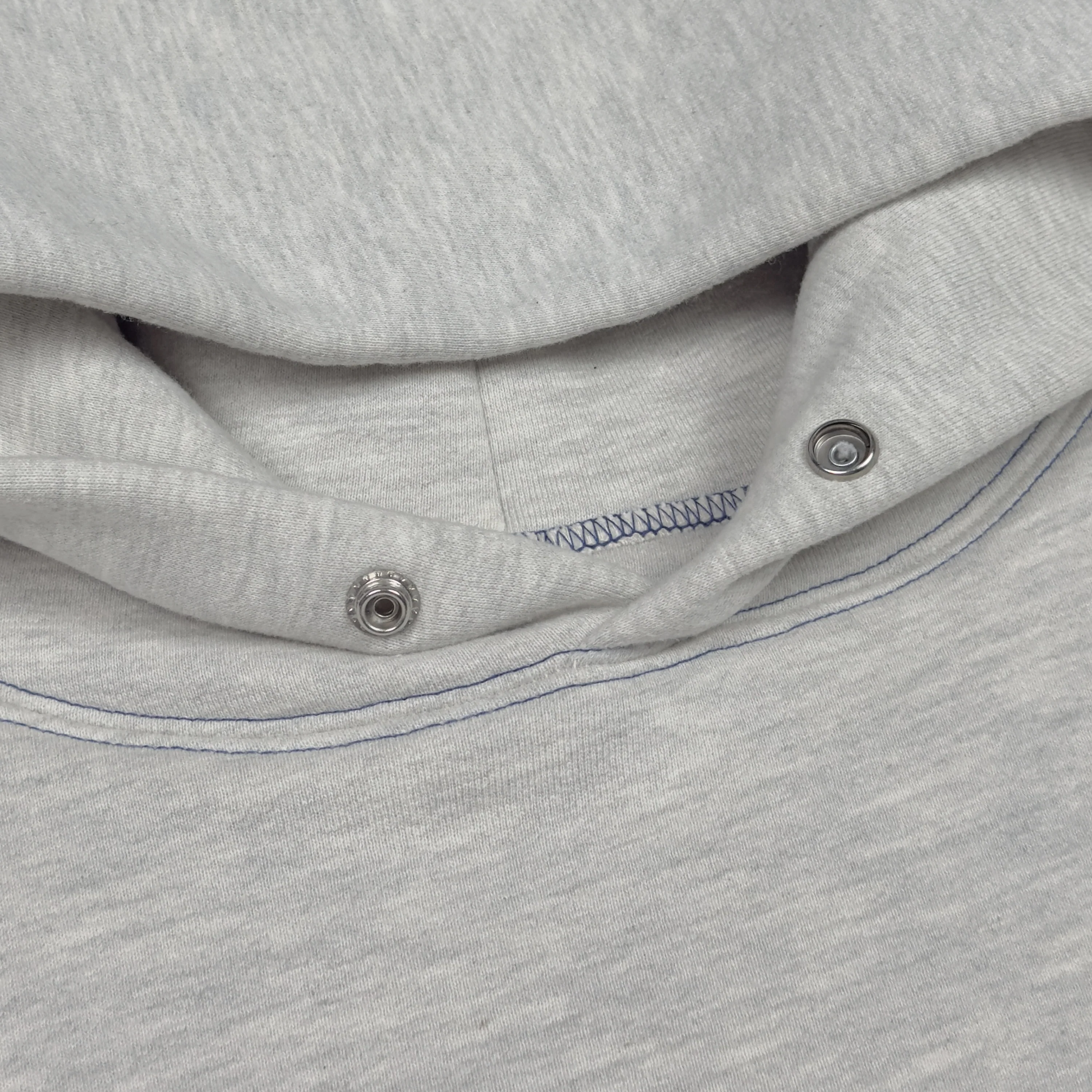 YZY 2019 Unreleased Snap Button Blue Stitch Perfect Hoodie crafted early during 2019 Jesus Is King & Wyoming Era. This Heather Grey Double Layered Hoodie was notoriously seen on Ye & was gifted to some of his Friends & Family. This hoodie features straight pockets with snap buttons on the inside for extra securing. The hood has snap buttons as well for a tightening option.
